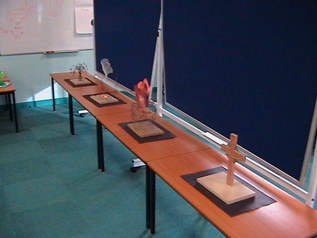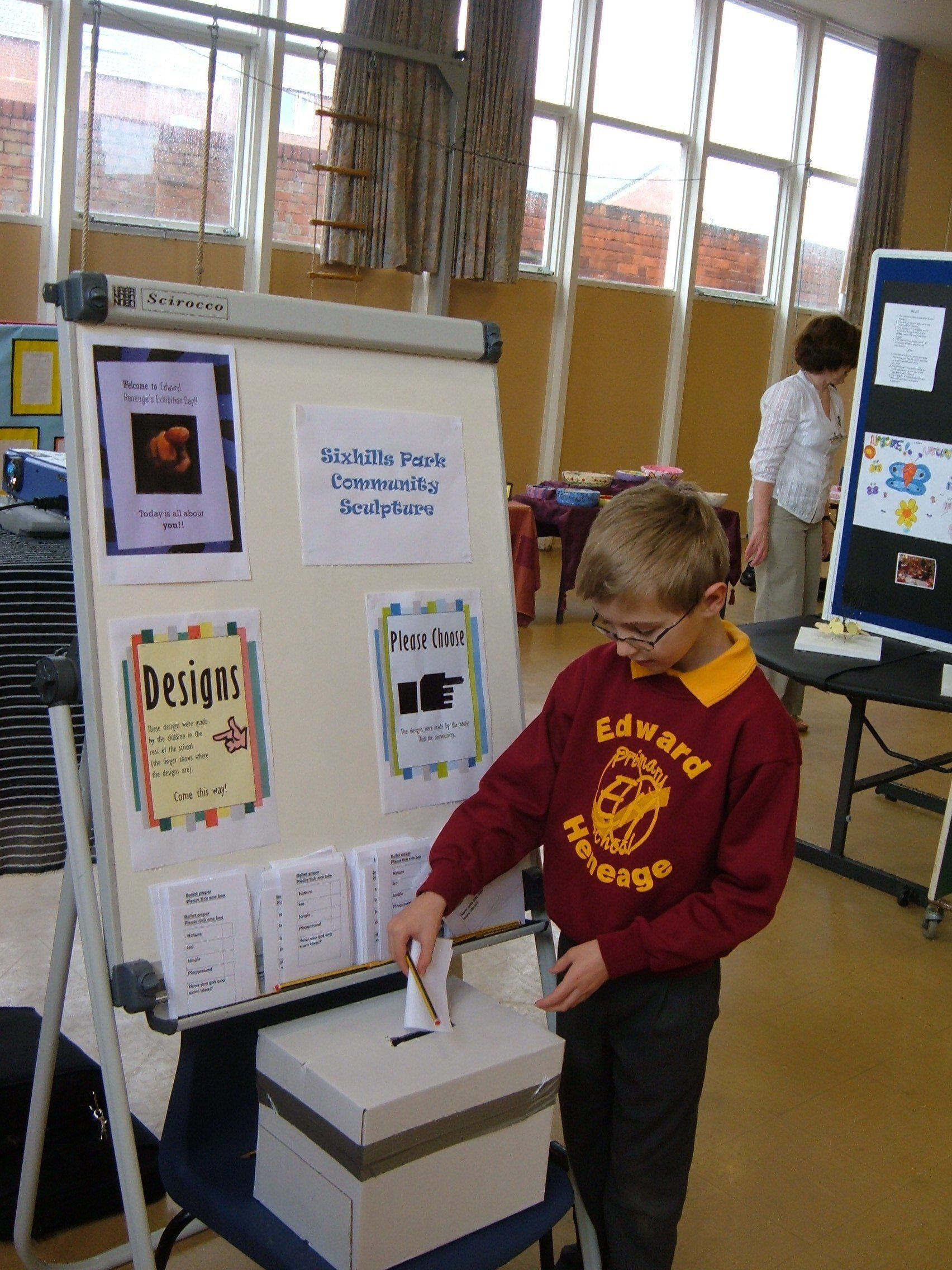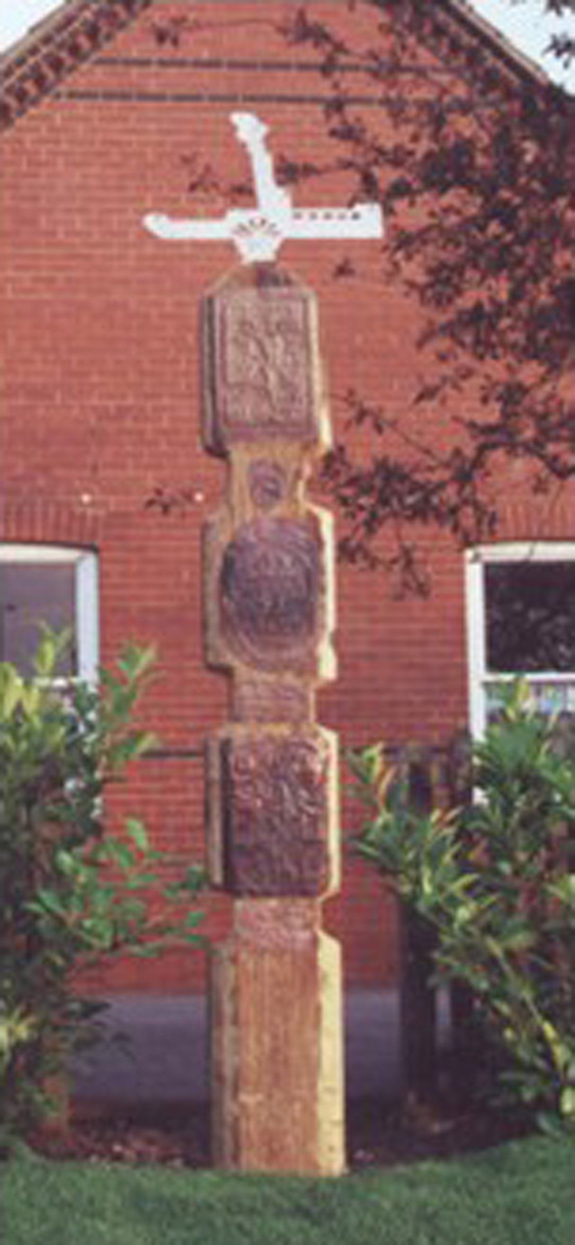 In these images you can see several projects which are more installations than sculpture per say, and several pictures show process – making, ideas and design workshops, and voting. One of the pictures shows the children (Year 6) of this small Primary School working out how to move the totem pole into place using levers and ropes, and another image shows the children digging foundations for the sculpture – real work, we call it, and it’s an important part of the project – see more on this under school projects tab.